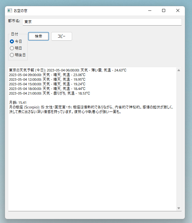 3月の末頃からぼちぼち作り始めてた天気予報と月齢、月星座のプログラム。やっとこできました。
